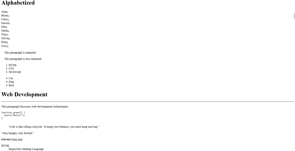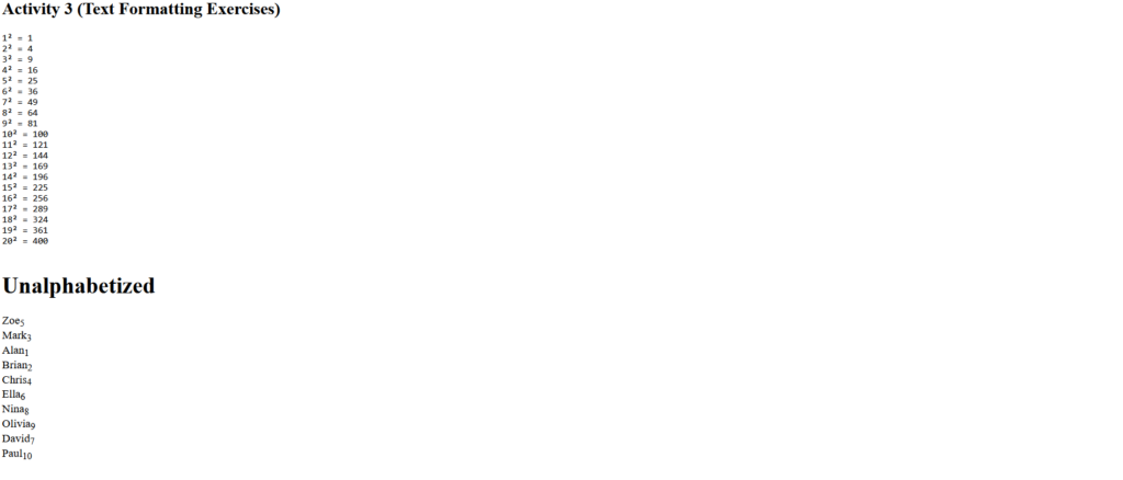 In this activity, I learned how to format text using HTML tags such as headings, bold, italics, and paragraphs. This helped me understand how to make content clearer and more organized on a webpage.