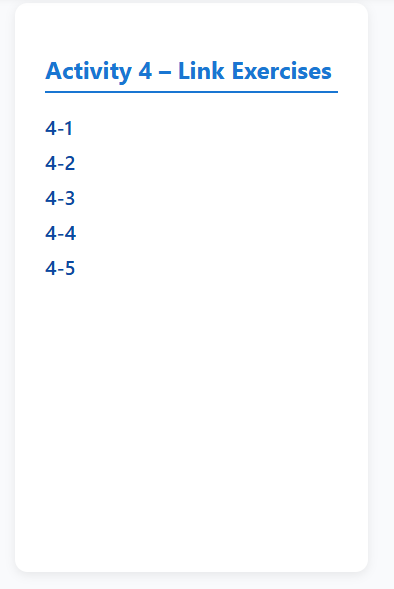 This activity taught me how to create hyperlinks using the <a> tag. I learned how links connect different pages or websites and how they improve navigation within a site.